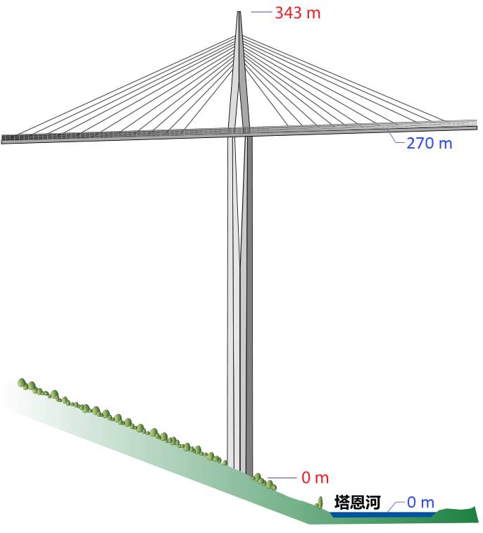 以米約高架橋為例,圖中藍(lán)色數(shù)字標(biāo)注為橋面高度,紅色數(shù)字標(biāo)注為結(jié)構(gòu)高度。